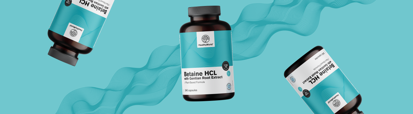 Betain HCL neboli také betain hydrochlorid je přírodní sloučenina, která v našem těle může fungovat jako dodatečný zdroj chlorovodíkové kyseliny, což ovlivňuje kyselost žaludku. Vyšší kyselost v žaludku je důležitá pro: