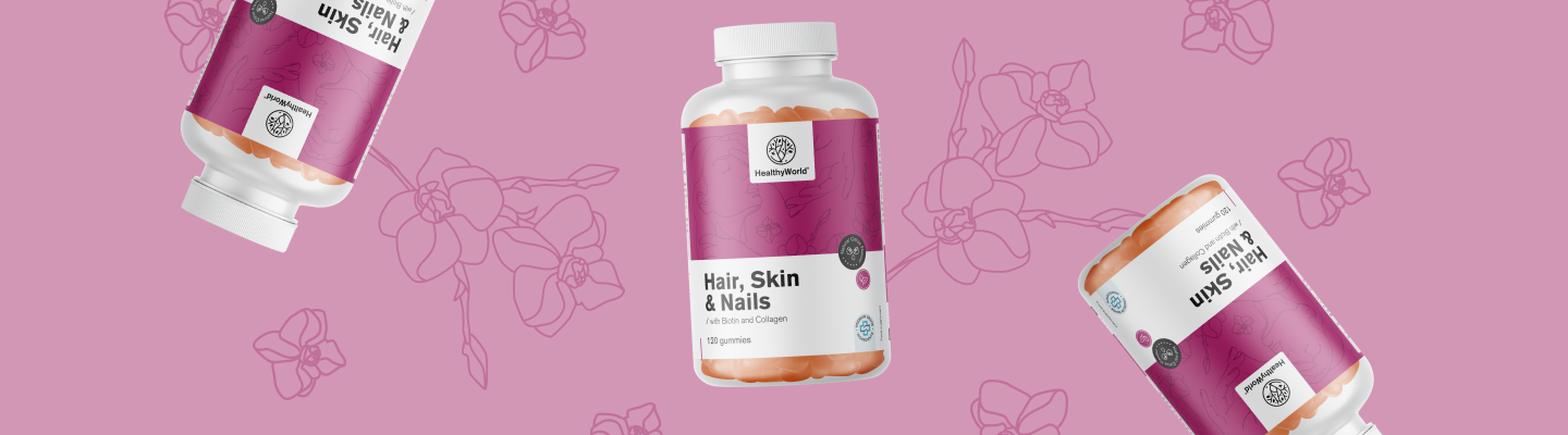 Hair, Skin & Nails jsou gumové bonbony, které obsahují 3 vitamíny a kolagen, které optimálně pečují o vlasy, pleť a nehty a zároveň: