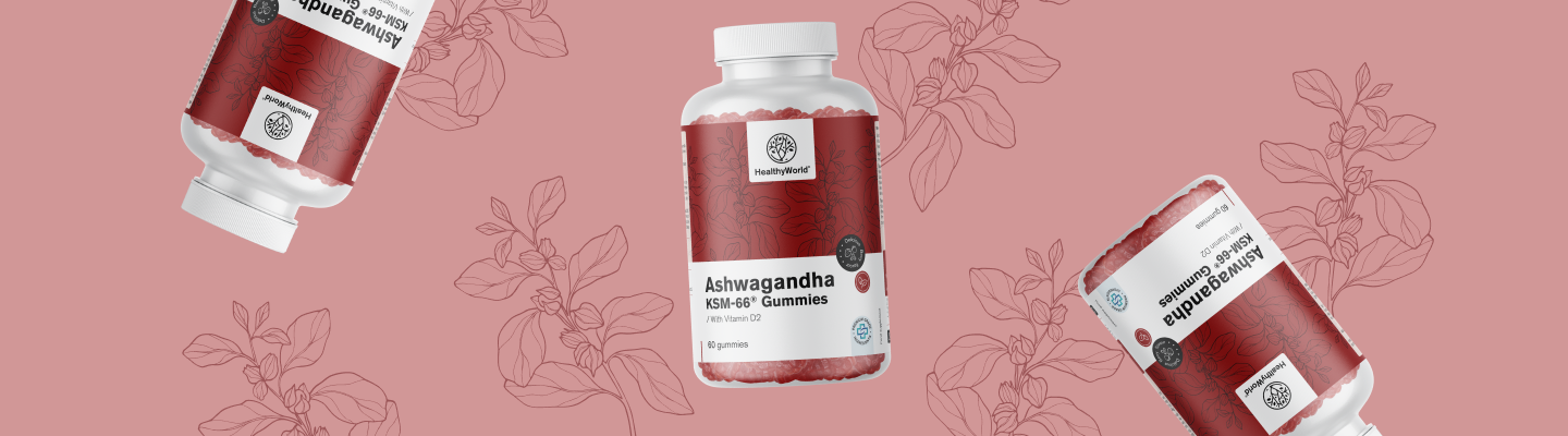 Složení: glukózový sirup, cukr, voda, sušený výtažek kořenů ašvagandy KSM-66® (Withania somnifera (L.) Dunal), želírující látka: pektin, regulátor kyselosti: kyselina citronová, regulátor kyselosti: kyselina mléčná, přírodní aromata, regulátor kyselosti: citrát sodný, barvivo: koncentrát ředkvičky, ergokalciferol (vitamín D2), rostlinný (palmový) olej, potah: karnaubský vosk.